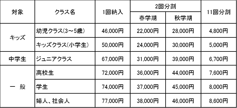 幼児・小学生・中学生・一般クラス(含む,学生)があります。